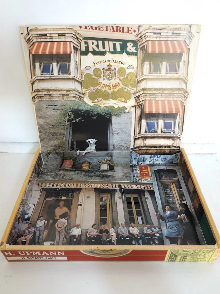 Collaged cigar box with pop-up elements.
