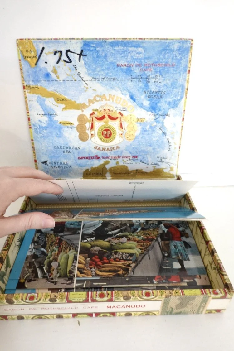 Collaged cigar box with postcard book.