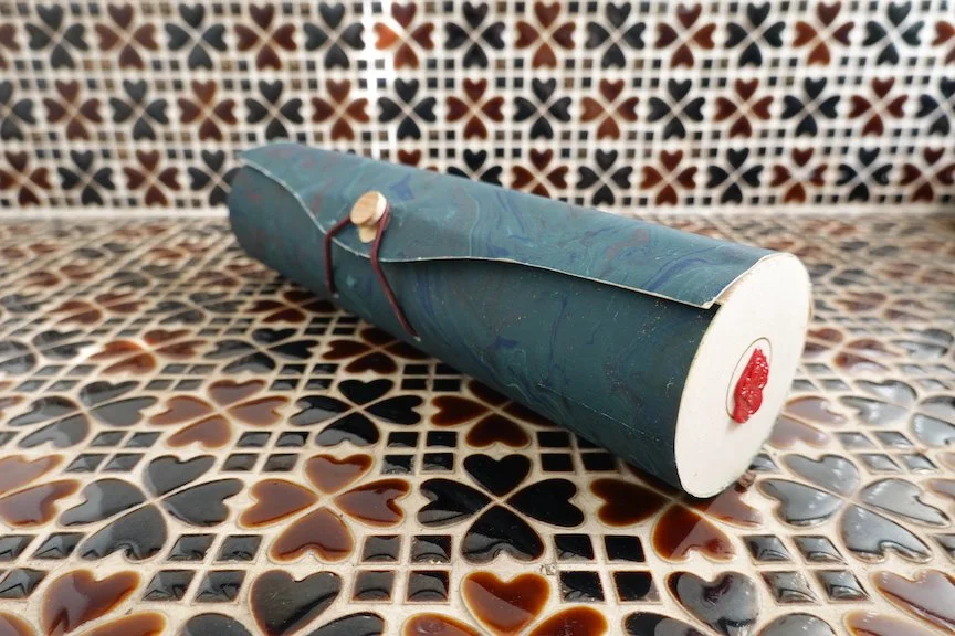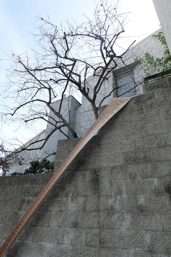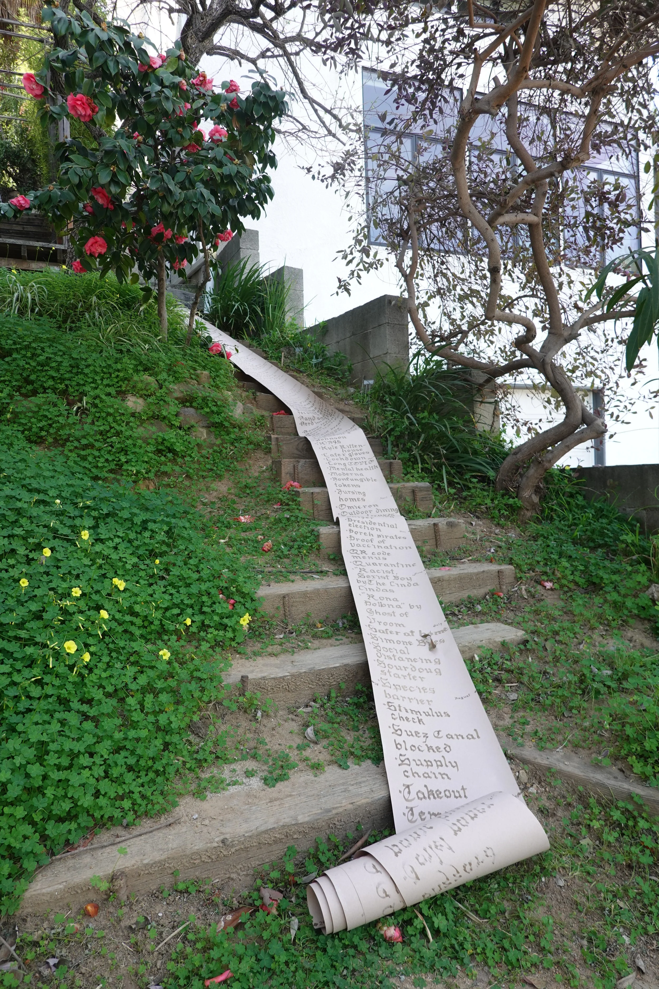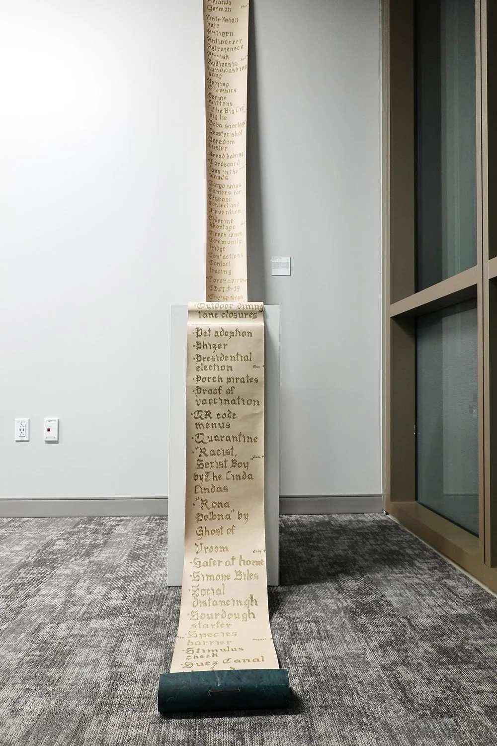 Doom Scroll: Anni Mirabiles February 2020-February 2022 is a 24-foot-long paper scroll inked in February 2022, reflecting on two years of Pandemic life. It is an alphabetical record of 100 entries related to the period, handwritten in Blackletter calligraphy. The entries are a mix of references to specific world events and vocabulary that entered the general lexicon during this time. The resulting length of the scroll is both a comical and sympathetic visual for how excessively long Covid has raged, how much we’ve been through. The length is marked in 6-foot increments (the then-familiar social distancing allotment) along the left edge, and the months (1 per foot) from February 2020-February 2022 are marked along the right edge.