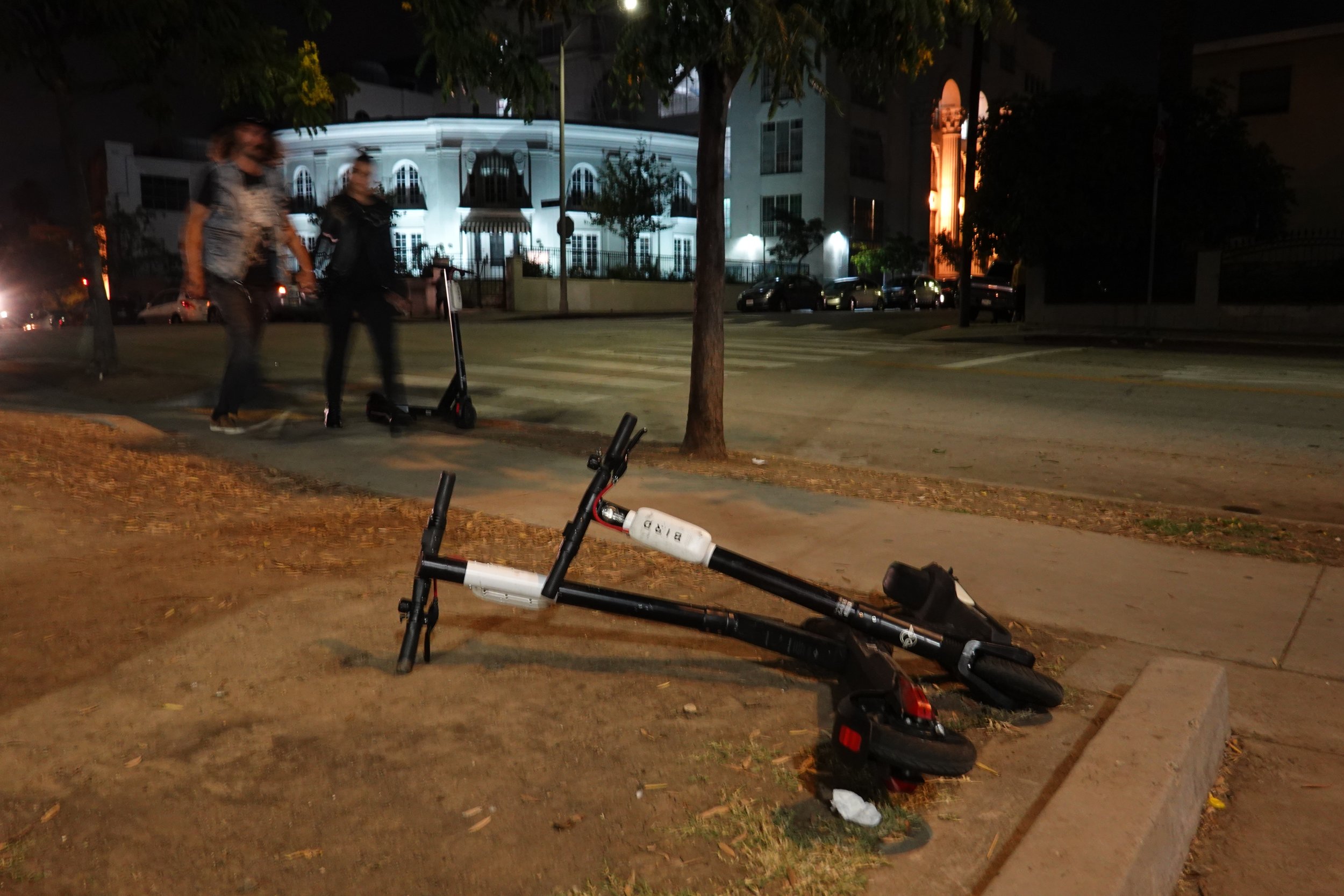 For-profit, drop-anywhere electric scooter rental touches on so many of Los Angeles’ current issues: Privatization of public space, gentrification, prioritization of tourism, insufficient public transportation… Not to mention a general matter of ableism. The scooters raise the essential question, "Who are the streets for?" Never is this question more pointed than when a scooter has collapsed across the sidewalk. That the companies colonizing the streets have no incentive to even create an effective kickstand speaks volumes. By documenting this quirk, I aim to reawaken viewers to the absurdity of this neoliberal enterprise.